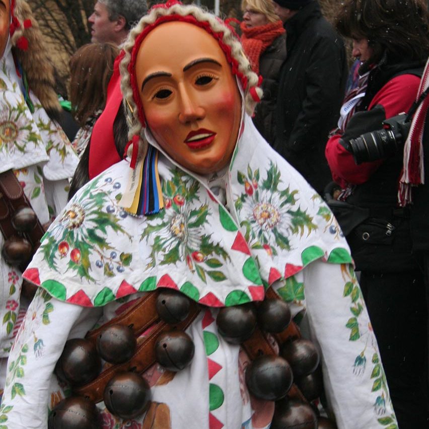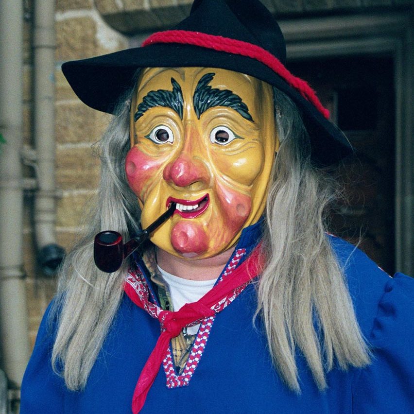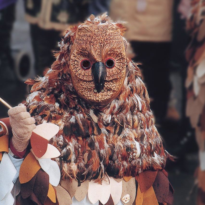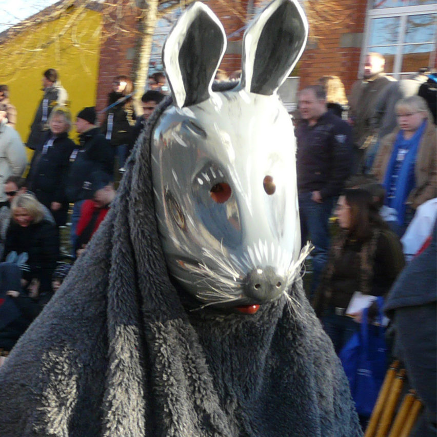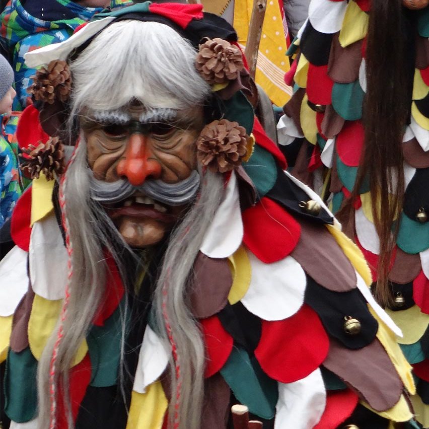 Die an der Seite des Larventuches aufgemalten Sonnenblumen, sowie die Sonne auf dem Rücken des Narrenkleides künden den herannahenden Frühling an.