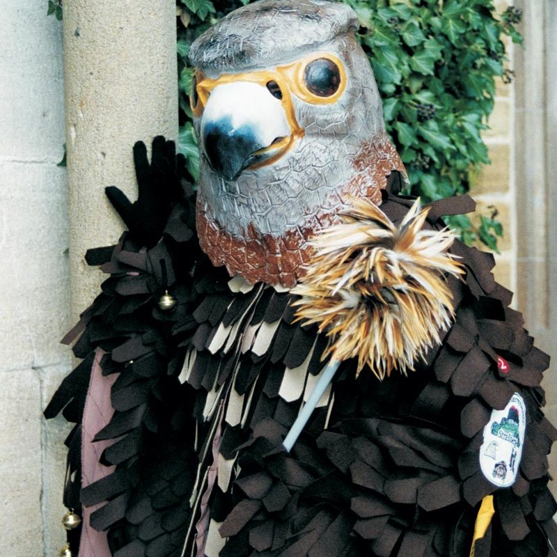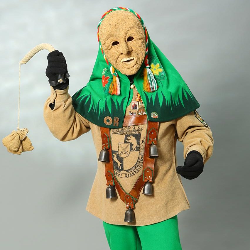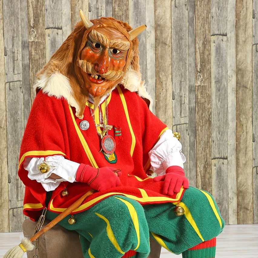 In der Hand hält der Narr einen Korb mit Süßigkeiten und einen Stecken, der den Spitznamen der Zimmerner, den „Zimmerner Stecken“ trägt.