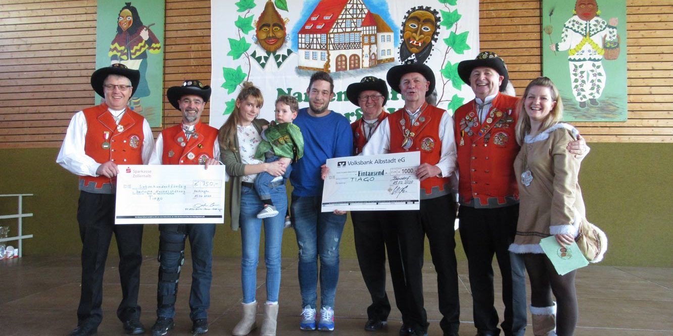 Anlässlich der Kinderfasnet am vergangen Samstag in Binsdorf konnten Vertreter des Narrenfreundschaftsrings Zollern-Alb so an Tiago und seine Eltern die stattliche Spende direkt in seinem Heimatort überreichen.